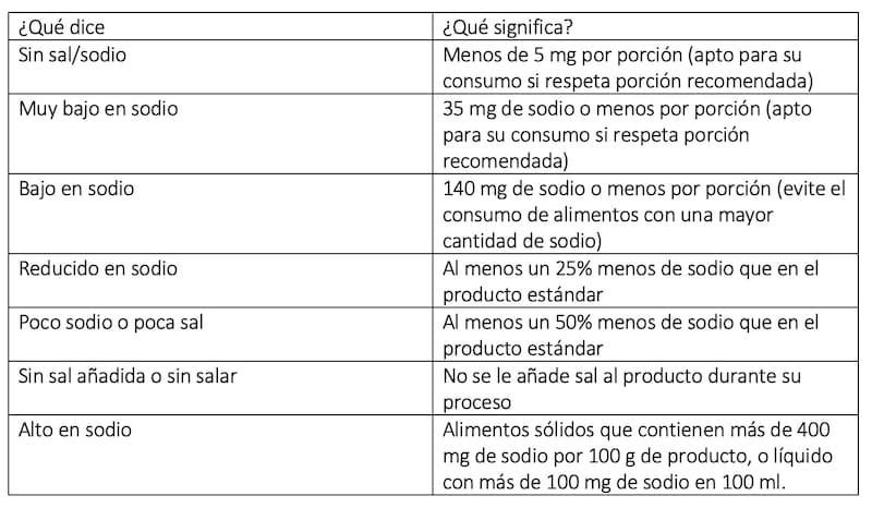 En el otro extremo, si un producto tiene 5 miligramos o menos de sodio por 100 gramos, entonces se trata de un alimento libre de sodio. En el siguiente cuadro resumen están todas las clasificaciones de los alimentos según sus cantidades de sodio.