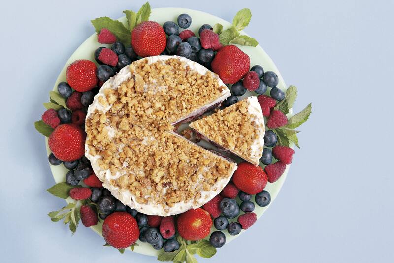 Para armar el postre forrar un molde redondo de 15 a 18 centímetros de diámetro con papel plástico. Poner una base de crumble, usando la mitad de la mezcla horneada, luego, poner la mezcla de berries y cubrir con el resto de crumble.