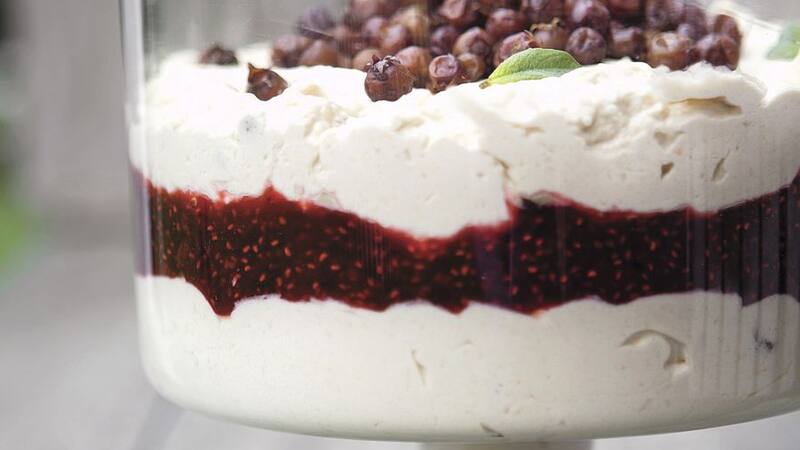 4. En un copón de vidrio o fuente grande colocar la mitad del mousse de chirimoya y murta, dejar cuajar 10 minutos en el refrigerador. Retirar del refrigerador, distribuir la salsa de frambuesas reservada y encima colocar el resto del mousse. Emparejar la superficie y refrigerar hasta cuajar. Servir decorado con el resto de murtas y hojas de menta.