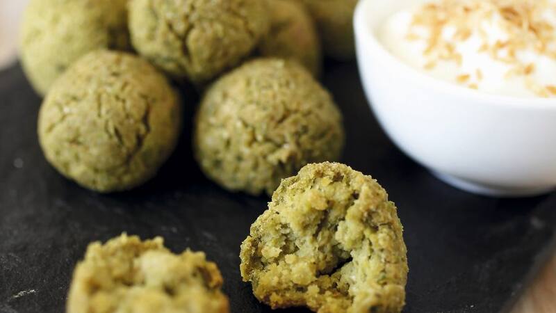 En la misma procesadora agregar por encima los garbanzos crudos y colados (sin líquido) y procesar de a poco, para no fundir la máquina, hasta obtener una pasta verde y húmeda con pequeños «grumos» de garbanzos, que le darán textura al falafel por dentro. Pasar la mezcla a un bol.