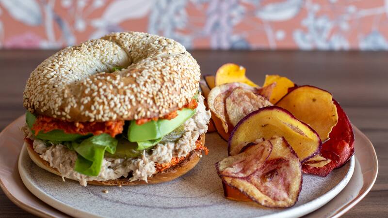Abre los bagel y tuesta en el horno, pon en cada lado una capa de pesto de tomates. Corta el pepinillo en rodajas y la palta en láminas