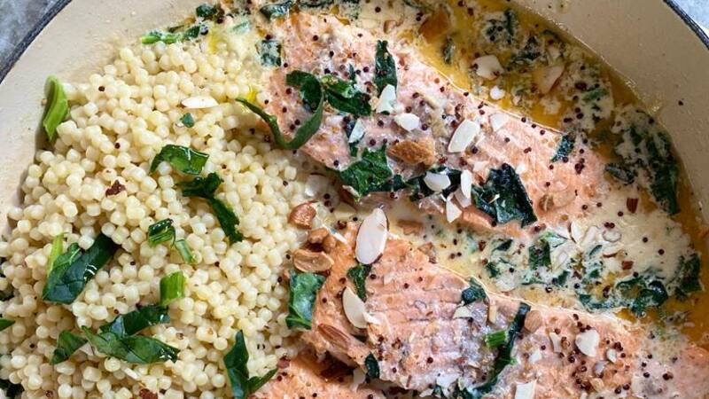 Agregamos la crema, las espinacas, ½ taza de albahaca y los tomates, revolvemos un poco, agregamos sal y pimienta, ponemos nuevamente los trozos de salmón y tapamos. Cocinamos a fuego bajo por 4 minutos.