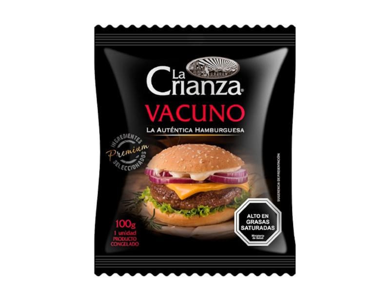 Como “parrilleras” y “excelente fuente de proteínas” se autodescriben estas hamburguesas de cien gramos, mezcla indeterminada de vacuno, chancho y —como es costumbre en este tipo de productos— varias cosas más, algunas difíciles de pronunciar. Además, ostenta el sello de alto en grasas saturadas y también marca más de doscientas calorías por unidad.