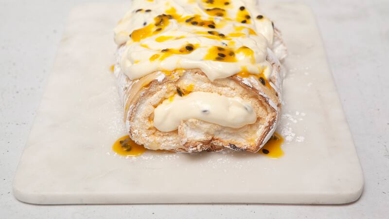 - Esparcir el tercio restante por encima y chorrear con la pulpa de maracuyá reservada.