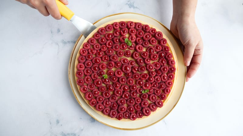 - Cuando la crema pastelera esté fría, mezclar con un batidor con movimientos fuertes, hasta que quede una crema lisa y homogénea. Poner sobre la masa ya horneada, repartir frambuesa por toda la superficie con su cavidad hacia arriba, y rellenar cada una con el gel de frambuesas.