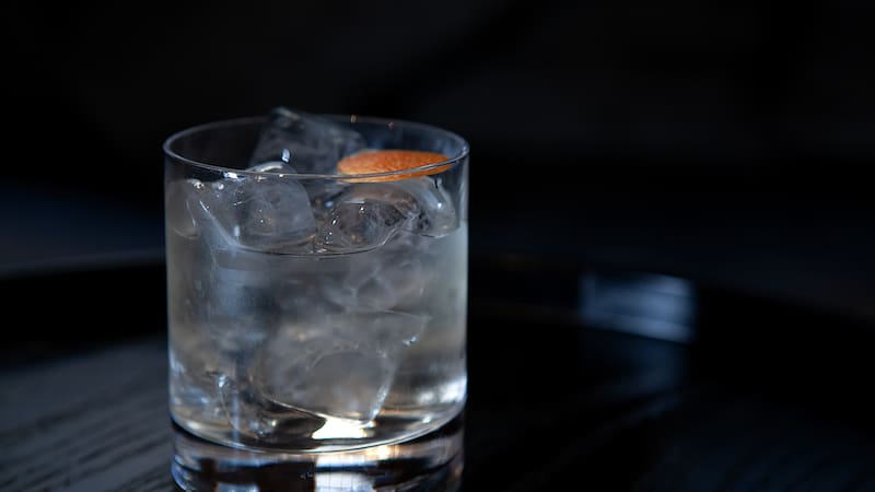 - Servimos en un vaso corto (old fashioned) lleno de hielo y decoramos con una cáscara de pomelo.