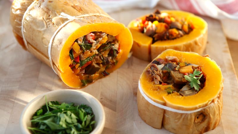 En esta receta de Macarena Montesinos, el butternut es el recipiente que contiene una deliciosa y colorida mezcla de vegetales. Al ser cortado en rodajas, adquiere una atractiva y novedosa presentación. La cocinera da algunos tips para la preparación, como reemplazar los tomates deshidratados, en caso de que no tengas, por tomates cherry en mitades, o que uses las verduras que tengas disponibles para el pino de tu relleno. Ideal para darle calidez a tu invierno.