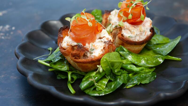 - Precalentar el horno a 180º C y uslerear las rebanadas de pan hasta que estén bien delgadas. Pincelar cada una con mantequilla derretida por ambos lados y luego poner en moldes de cupcakes pequeños. Hornear por 10 minutos o hasta que el pan esté levemente dorado y crujiente. Sacar del horno y dejar enfriar.