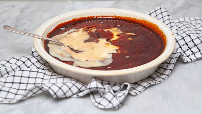 - Verter a través de un colador en la fuente o pocillos a prueba de horno y refrigerar con papel alusa en contacto hasta servir.