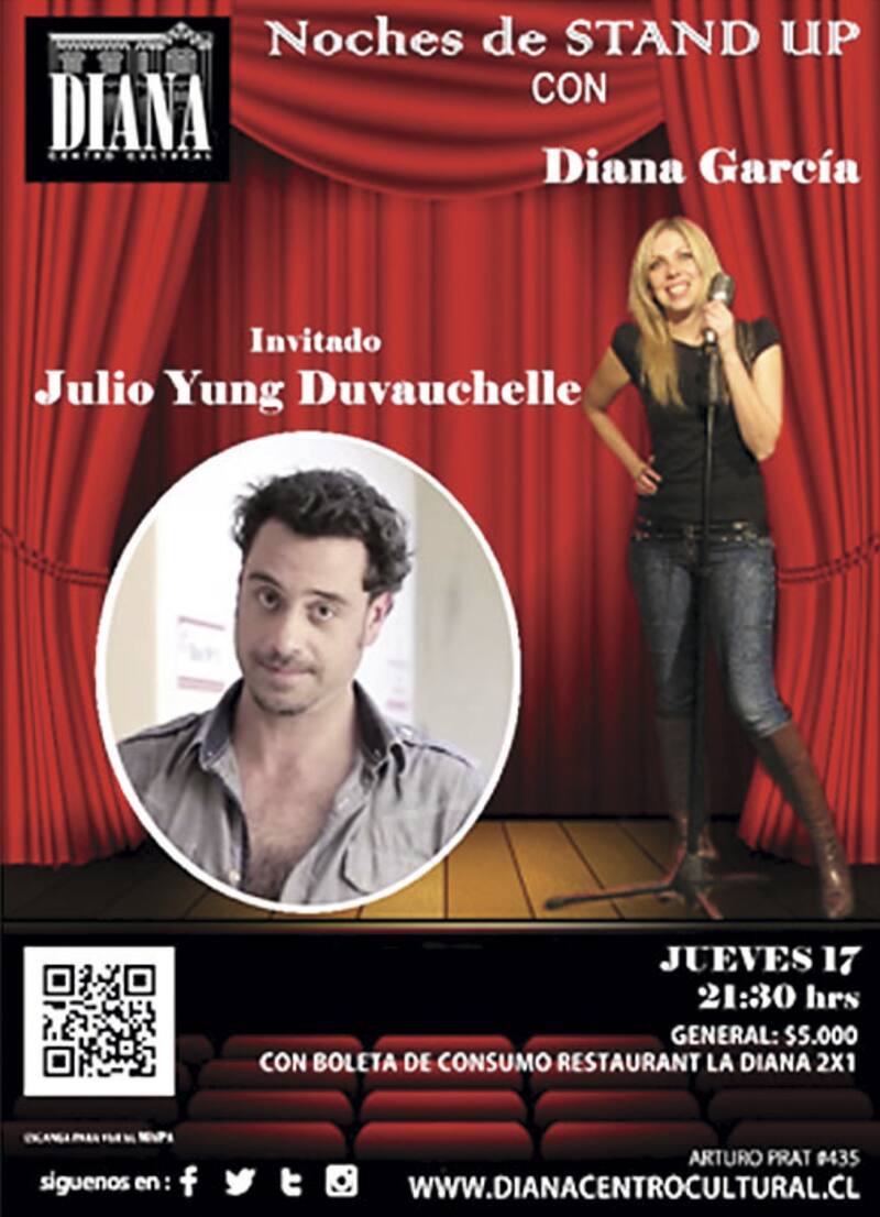 Todos los jueves de marzo, la actriz y comediante Diana García será la anfitriona de recibir a diferentes comediantes, quienes relatarán en formato stand up hilarantes anécdotas y temas de contingencia con ácido humor. Los monólogos comienzan a las 21:30 hrs y hoy el invitado es el actor Julio Jung Duvauchelle. El jueves 24 será el turno de la actriz Yamila Reyna y para terminar el mes, el 31 de marzo, se presentará el actor y sociólogo Héctor Escudero. Teatro Diana, Arturo Prat 435. $ 5.000, 2x1 presentado boleta de consumo en el restorán La Diana. www.dianacentrocultural.cl