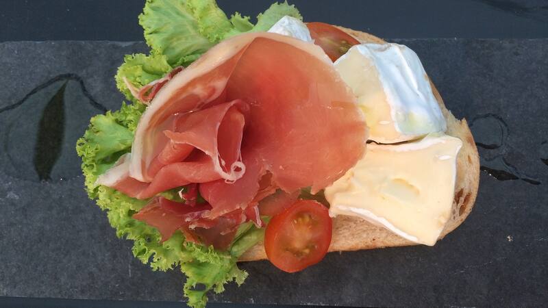 BRUSCHETTA DE JAMÓN SERRANO, TOMATES CHERRY Y QUESO CAMEMBERT