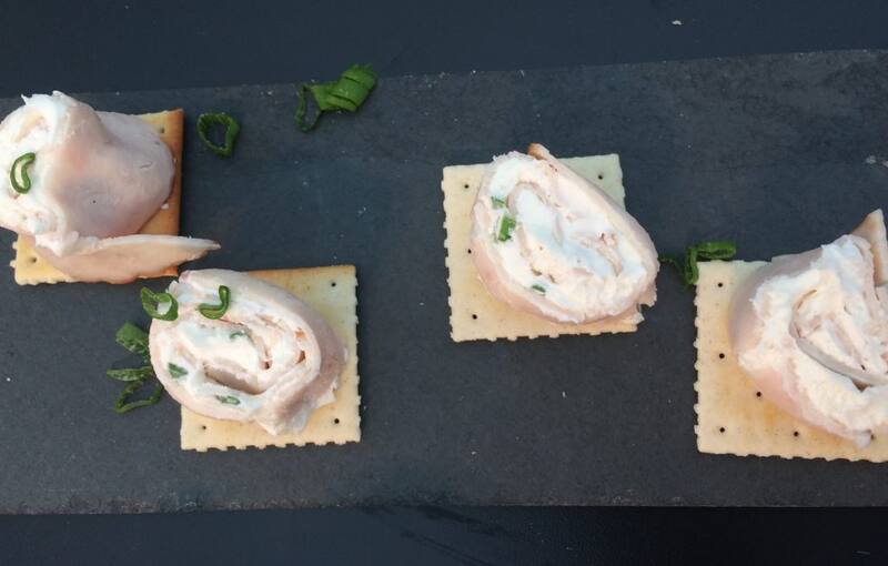 2. Untar sobre una lámina de pechuga de pavo una capa delgada de la preparación de queso crema. Enrollar sin presionar. Cortar el rollito en rodajas de 1 cm de ancho aprox. y pinchar con mondadientes. Decorar con ciboulette. Servir acompañado de galletas saladas.