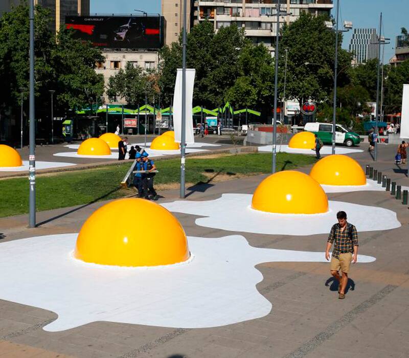 Una docena de huevos fritos desparramados en pleno Plaza Italia, ¿difícil de imaginar, no? En el contexto del festival Hecho en casa, el holandés Henk Hofstra presenta hasta este domingo su obra Art-Eggccident, una serie de huevos fritos de 10 metros de diámetro que invitan a que el transeúnte se relacione con ellos libremente y se cuestione el uso del espacio urbano.