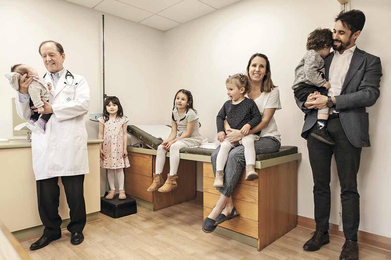 En 1983 Amparo Berenguer llevó al segundo de sus tres hijos, Gianfranco, entonces de 6 meses, al Hospital Roberto del Río ardiendo en fiebre. El niño tenía un problema a las vías urinarias y Amparo temía que se hubiera vuelto a enfermar. Su urólogo al verlo, le dijo: “No creo que sea algo urinario. Déjame consultar con Raúl Corrales, un pediatra broncopulmonar experto, que le tengo toda la confianza”. La madre se imaginó que iba a llegar una eminencia con el pelo canoso, pero en cambio, “entró un doctor joven, rubiecito, bajito, con zapatillas y un delantal largo que le llegaba a los tobillos”, recuerda Amparo. “Pero examinó con tanta paciencia a mi guagua, que me encantó. Me dijo que tenía una neumonía. Desde entonces se convirtió en nuestro doctor de cabecera”, relata. Sus hijos Chiara (37), Gianfranco (35) y Stefano Gazzana (27) se atendieron con él desde que eran guaguas en su consulta de la Clínica Alemana. Stefano, incluso, aprendió a caminar en la sala de espera de Raúl Corrales. Y ahora son Chiara y Gianfranco los que llevan a sus hijos (cuatro niñitas de Chiara y un niño de Gianfranco) a donde el doctor Corrales. “Es una satisfacción ver a esos niños que atendí desde pequeños volver a la consulta convertidos en padres. Ahora la tarea es mantener sana a otra generación de la familia”, afirma el médico. Curiosamente, la relación se invirtió, ya que el menor de los Gazzana, Stefano, es kinesiólogo y le hace rehabilitación por lesiones a la rodilla a los dos hijos menores de Raúl Corrales. “Yo lo vi de guagua y ahora él atiende a mis hijos. Las vueltas de la vida”, dice el pediatra.