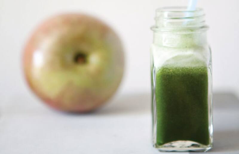 1.Pasar la manzana entera por el extractor de jugo y procesar el líquido resultante en la juguera, junto con el wheatgrass, hasta que esté bien mezclado. Beber de inmediato.