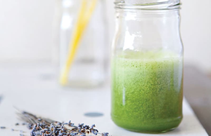 1. Pasar 1 manzana lavada por el extractor de jugo. Batir el líquido resultante en una juguera junto a 2 tallos pequeños de apio, 6 hojas de lechuga y 1 puñado pequeño de flores secas o de hojas frescas de lavanda. Añadir un poco de agua si se desea una contextura más líquida. Servir de inmediato.