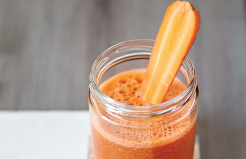 1. Pasar las zanahorias por el extractor de jugo y batir el líquido resultante junto con el jengibre en la juguera. Servir de inmediato.