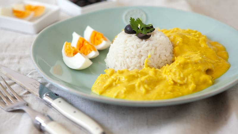 6. Vierta la salsa en una fuente y deje solamente el pollo en el vaso, revisar que la mariposa esté bien puesta y desmenuzar 3 seg/giro inverso/vel 4. Agregar el pollo desmenuzado a la salsa, mezclar y espolvorear el maní o nueces y/o el queso. Decorar con aceitunas y huevo duro. Sirve caliente, acompañado de arroz blanco o papas cocidas.