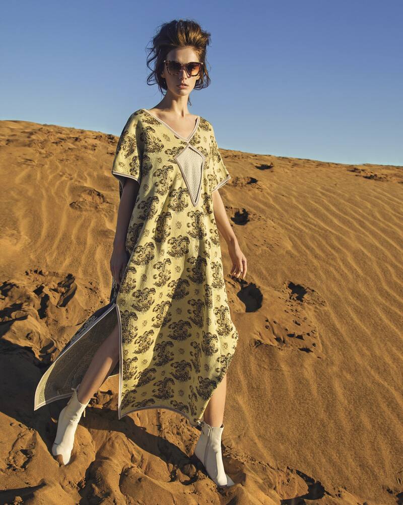 Túnica Sergio Dávila, consultar precio en tienda Porquetevistes. Botines, $119.900, Nine West. Anteojos Prada, $259.900, en ópticas GMO.[/caption]