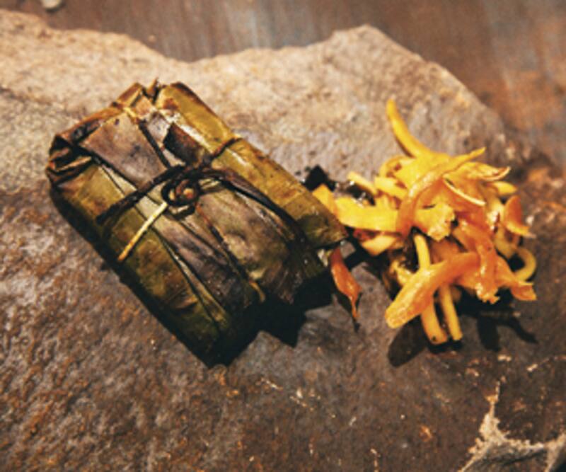 Pescado del día con curry sudaca –ají verde, semilla de cilantro, limón y jengibre– envuelto en hojas de plátano (tipo humita) cocinado a las brasas. Acompañado con ensalada de mango verde, camote frito y luche, con vinagre de arroz, limón de Pica y jugo de naranja. Fotografía: José Amunategui.