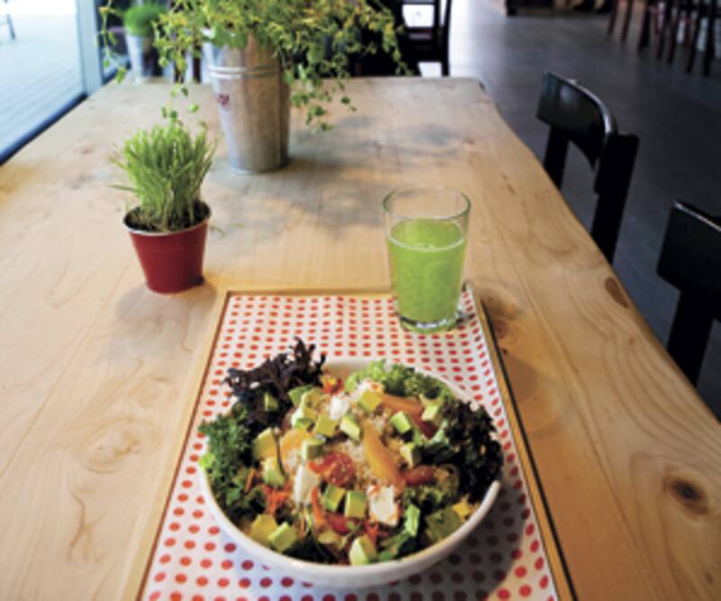 La generosa ensalada tres quínoas con kale y queso de cabra, mix verde, palta, gajos de naranja y aliño de aceto, mostaza y miel; y el wrap de falafel de quínoa con verduras ralladas y goji, aderezado con salsa de yogurt y menta, uno de los más celebrados. Los platos calientes son la sorpresa del día: puede ser desde un charquicán de mechada hasta polenta cremosa con salmón. Imperdibles los jugos naturales, limonadas y tés helados que preparan en el minuto.
