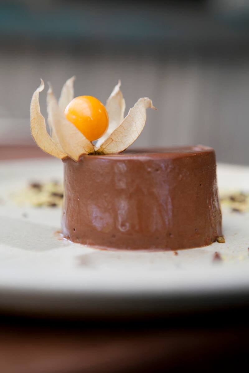 Pastel triple de chocolate: cremoso de cacao con base hecha de maní y cacao, encima un bombón de chocolate denso amargo que llega bañado crema de cajú ($ 4.600).