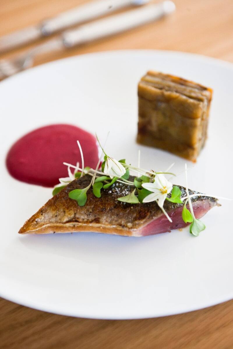 Pescado de roca con milhojas de tubérculos y muselina de betarraga.[/caption]