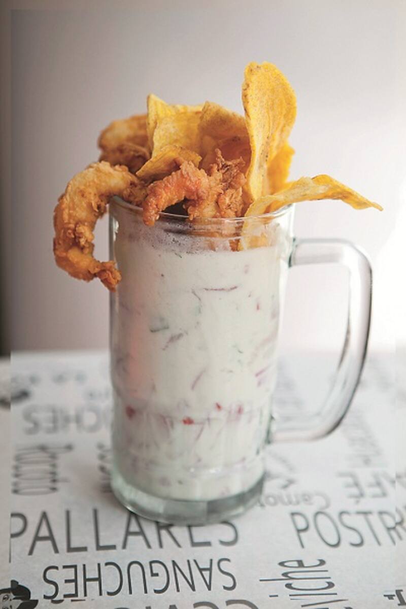 De reineta en trozos, con limón de Pica, cebolla morada, cilantro y abundante leche de tigre que llega servido en un vaso schopero con tres chicharrones de calamar y plátanos fritos ($ 5.500).