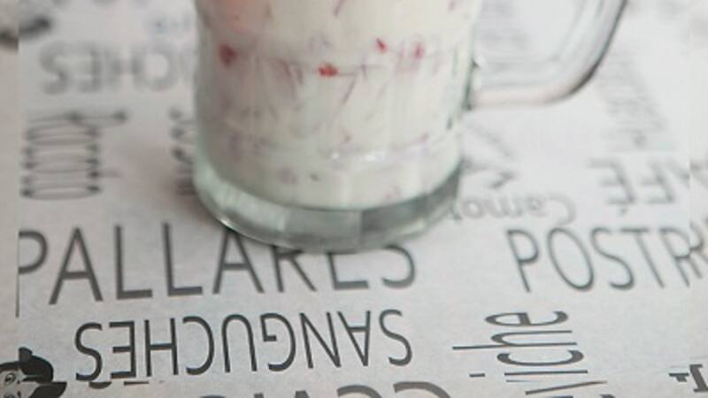 Sánguche de chicharrón de cerdo: sabroso costillar de cerdo cocido y frito, camote frito en rodajas, sarza criolla, hojas de hierba buena y cebolla morada, servido en pan francés ($ 5.100).