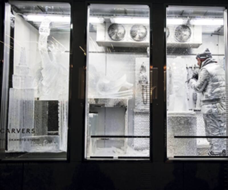 Con talladores de hielos en plena acción, vestidos con la exclusiva marca de ropa de montaña Moncler, recibe a sus clientes la tienda Barneys.