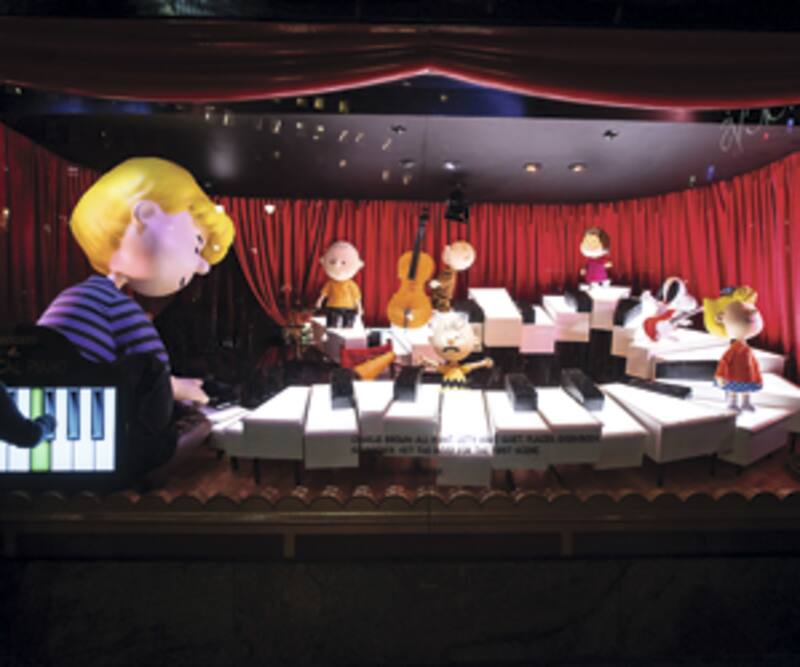 La tienda Macy's de Herald Square les hizo un tributo a los 50 años de La Navidad de Charlie Brown. En todas sus ventanas hay elementos táctiles como este piano que puede ser tocado por los transeúntes.