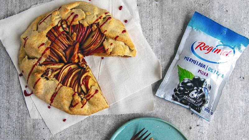 - Para armar la galette, primero hay que estirar la masa bien delgada, uslereando en todos los sentidos y dando vuelta la masa constantemente para evitar que se pegue a la mesa (la idea es hacer una forma circular, pero de bordes irregulares). Poner la masa sobre una lámina de silicona o papel mantequilla para hornear, pintar el centro con la mermelada de mora Regimel y rellenar con las manzanas ya preparadas, evitando poner el líquido que hayan soltado. Luego cerrar los bordes, dejando el centro del relleno a la vista Finalmente pintar los bordes de masa con mantequilla derretida y hornear en horno precalentado a 195 grados por 15 minutos. *El tiempo de cocción puede variar según el horno o el tamaño de la galette