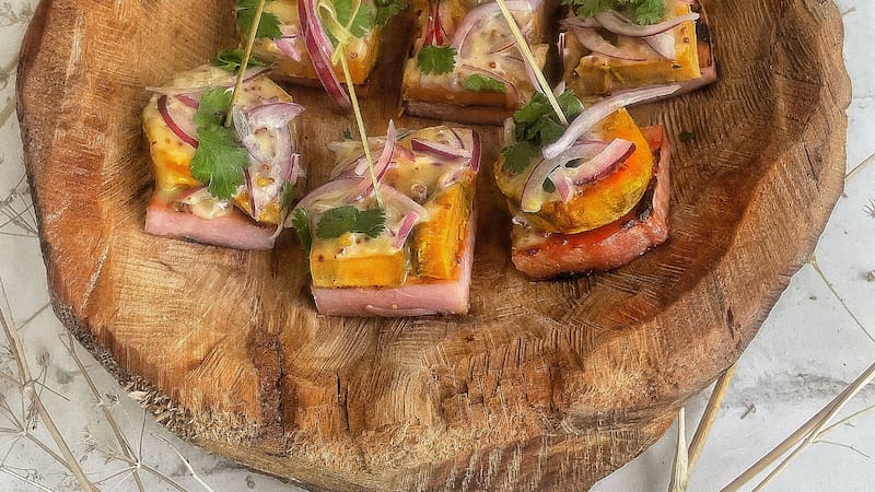 5. Para montar: poner sobre el jamón tostado los camotes asados ocupando toda su superficie y presionarlos un poco para que se adhieran bien. Luego rociar con la salsa de mayo y miel, poner bastante cebolla y cilantro.
