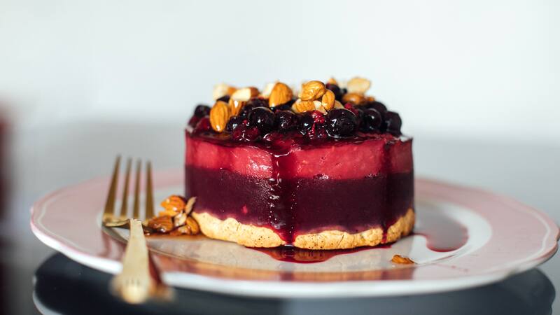 Este postre vegano lleva una harina creada por almendras y avena integral. Para el relleno, en vez de queso crema lleva una pasta de almendras con aceite de coco, ágave y arándanos y frambuesas. La clave para que todo quede con una buena consistencia, es el tiempo que pasa en el congelador. Mientras más exacto, mejor.