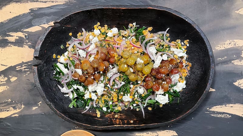 Aprende a hacer ensalada de lentejas rojas con queso feta, uvas y espinaca