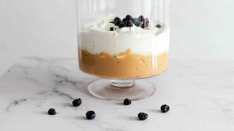 Cuando se pone el papel plástico para refrigerar la crema, hay que ver que la capa toque la mezcla, para así evitar que se forme una costra al momento de sacarla. Decorar con arándanos es buena idea para contrastar con un sabor cítrico.