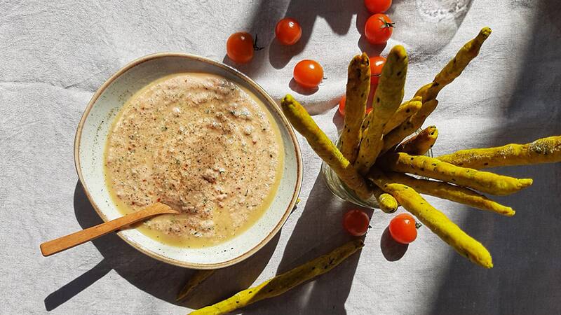 Aprende a hacer un dip de tomates y queso fresco con grisinis con cúrcuma y sésamo negro