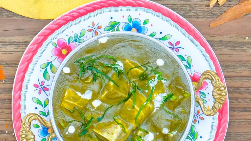 Este plato típico de la comida india se llama Palak Paneer. En el caso de utilizar espinacas congeladas, ponerlas en una olla y descongelar suavemente o a temperatura ambiente.