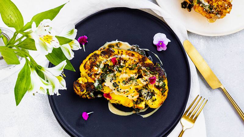 Aprende a hacer una coliflor especiada grillada, acompañada de chimichurri y aderezo de tahini
