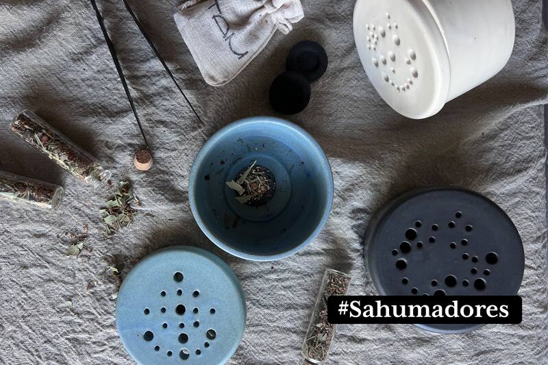 Cada sahumador viene en un pack que incluye sahumador, carboncillo, Blend de hierbas, pinzas y una base de piedra para poner encima el sahumador. “En un pocillo prendes con las pinzas el carboncillo y lo posas dentro del sahumador. Luego, de a poco, vas incorporando las hierbas que se hacen en mi taller con hierbas recolectadas a mano junto a recinas, que todas conjugadas hacen un Blend preciso para depurar y limpiar ambientes o según lo que quieras intensionar o sea tu propósito”, explica. También sirve para limpiar piedras energéticas.