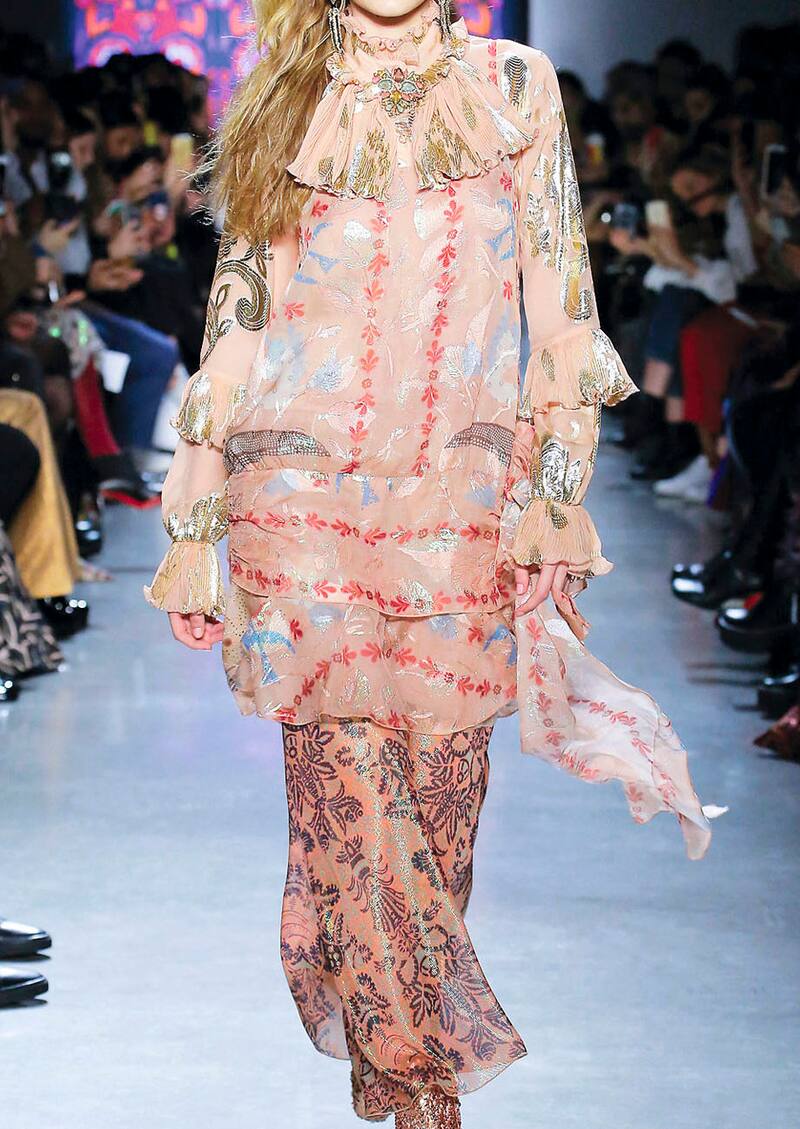Románticas: sedas y gasas vaporosas y transparentes, con flores de terciopelo o figuras brillantes se vieron en las pasarelas de Coach 1941 y Anna Sui. Ambas firmas confeccionaron trajes tipo pijama y vestidos cortos y largos, cerrados y con escotes, pero siempre llenos de vuelos y costuras abultadas.
