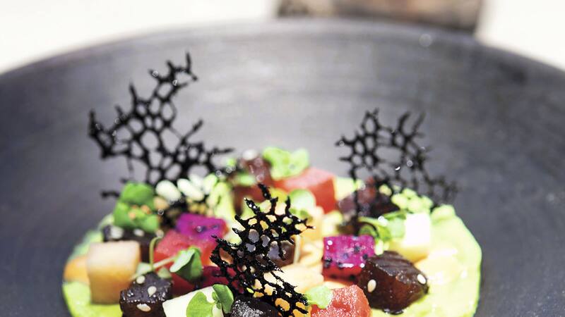 Atún marinado con frutas sobre emulsión de palta y salsa de chipotle