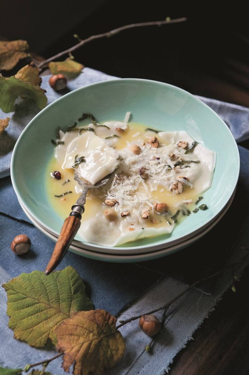 Ravioles de queso de cabra, avellanas y hierbas con mantequilla de salvia y avellanas (para 6 personas)