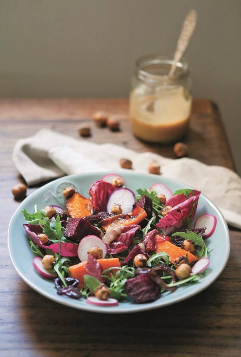 4. En una fuente de servir o en platos individuales distribuir las hojas verdes encima de las verduras asadas y rabanitos. Rociar con la vinagreta y decorar con las avellanas crocantes reservadas. Servir de inmediato.