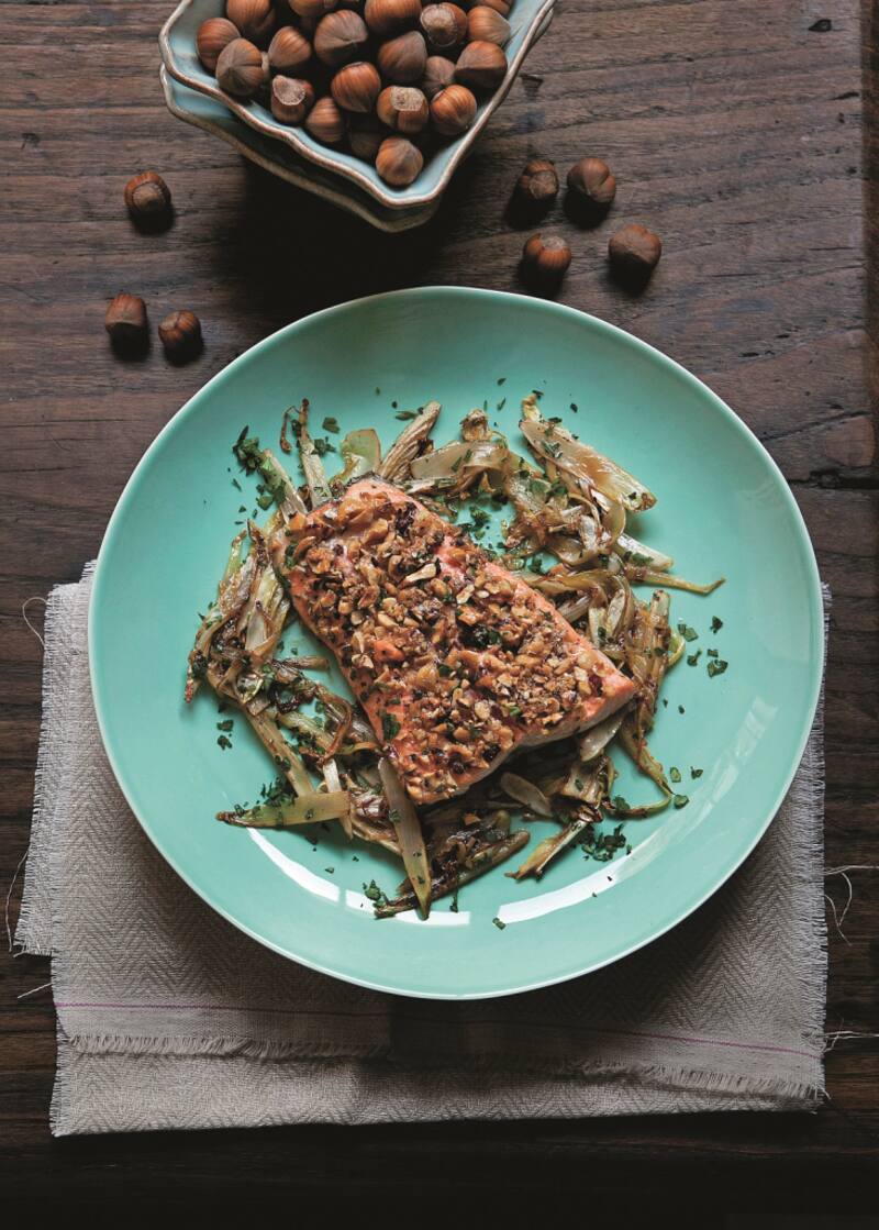 Trucha en costra de avellanas, mantequilla de limón y endibias acarameladas (para 2 personas)