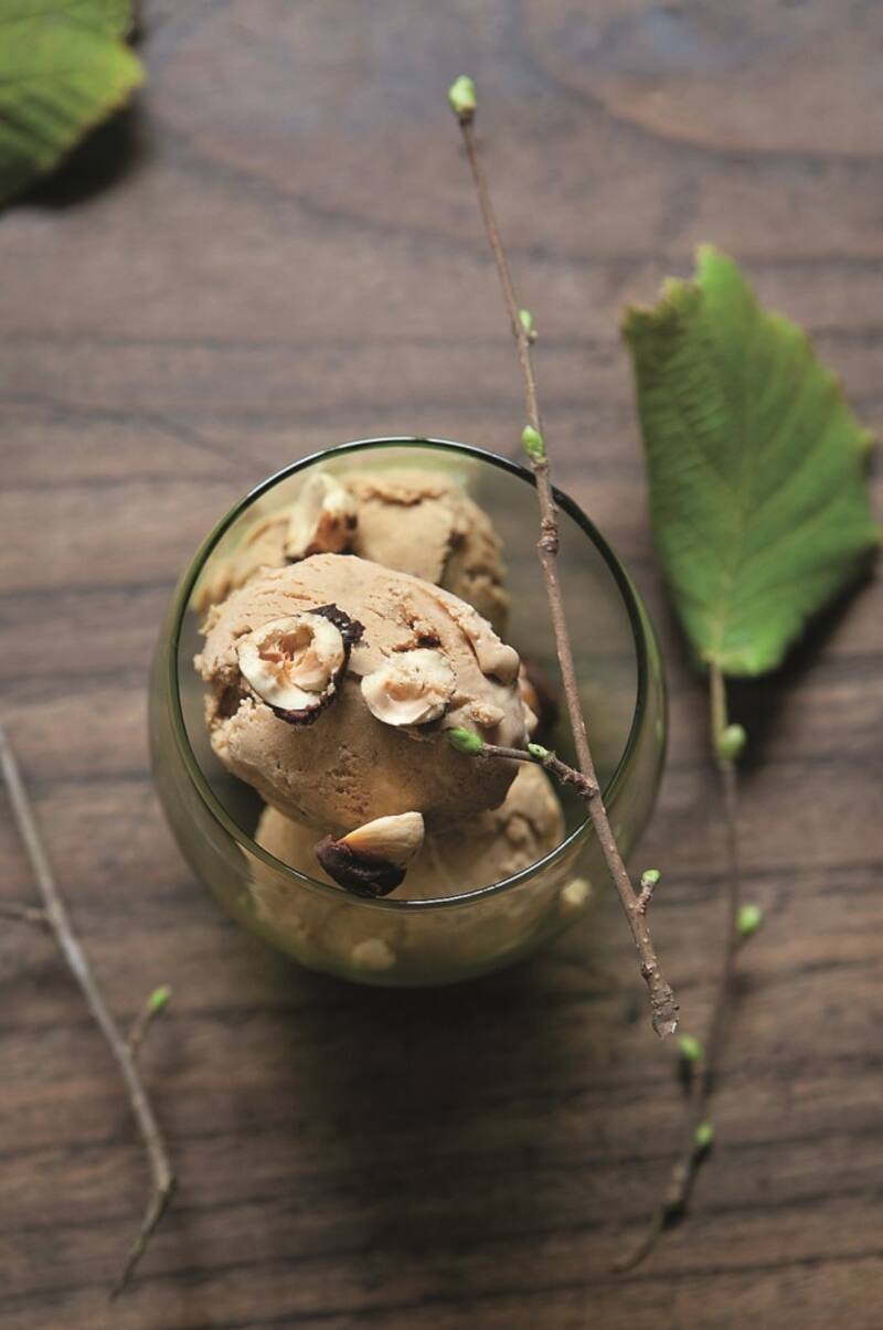 5. Retirar del freezer y colocar en la procesadora; procesar hasta que esté suave, volver el helado al bol y congelar en el freezer nuevamente hasta que esté solido. Este helado también se puede preparar en la máquina para hacer helados siguiendo las instrucciones del fabricante. Servir el helado decorado con avellanas tostadas.
