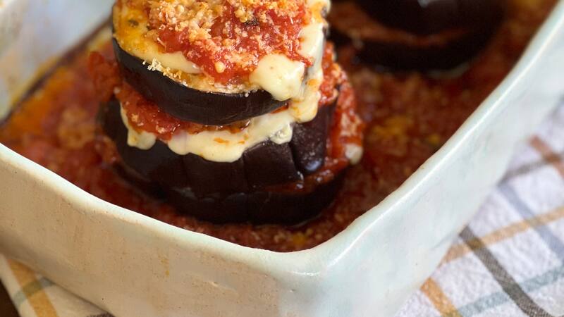 4. En una budinera o fuente para horno poner aceite de oliva, una capa de rodajas de berenjenas (no es necesario que queden pegadas una de otras), agregar una capa de salsa de tomates, un trozo (rodaja o lámina) de queso mozzarella y repetir el proceso. Lo ideal es que sean 3 o 4 capas (rodajas de berenjena) por cada porción.