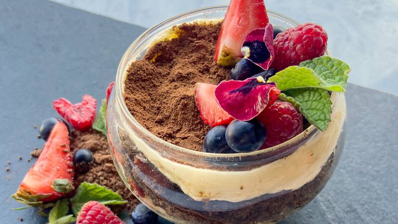 3. Para el fondo, agregar todos los ingredientes y remojarlos con el licor. Revolver bien y rectificar sabor. Colocar en una copa el fondo de galletas remojadas y en cada capa, agregar la crema del tiramisú hasta terminar.