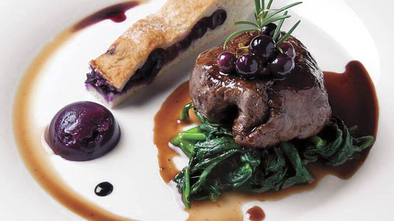 2. Secar la carne y sellarla por ambos lados en un sartén muy caliente. Sacar la grasa del sartén, agregar la salsa de uva y terminar de cocinar. La carne debe quedar a punto.