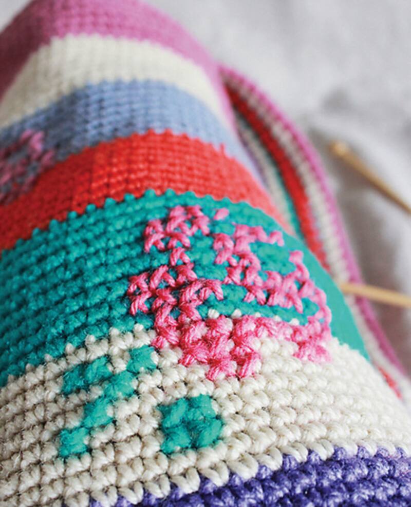 10. Para no cortar la lana cada vez que tengas que cambiar de color, teje con las hebras del color que no estás ocupando, por atrás.
